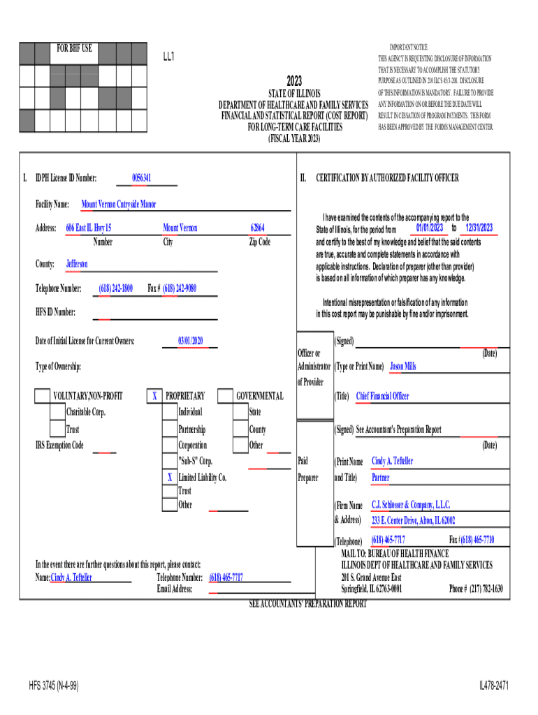This document is a comprehensive financial and statistical report for long-term care facilities in the state of Illinois for the fiscal year 2023. It provides detailed insights into the facility\'s operations, including income, expenses, occupancy rates, and a summary of the services provided. It also features certification by authorized facility officers and outlines the necessity for accurate reporting under Illinois regulations.