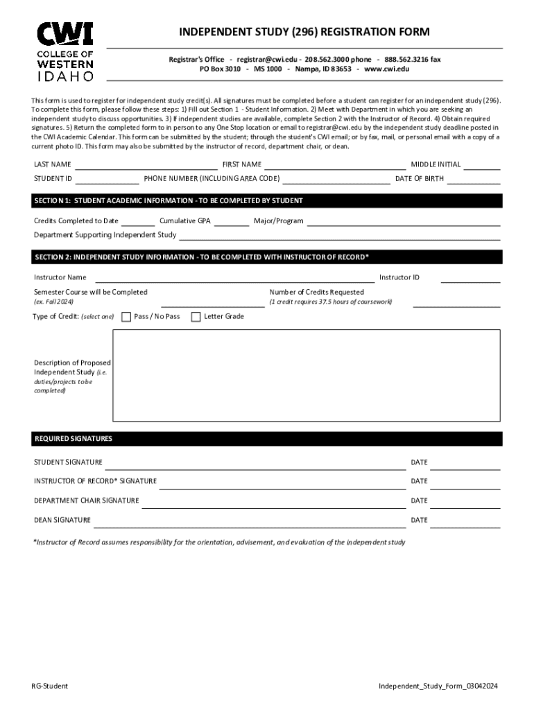 This form is utilized for registering independent study credit(s) at CWI. It requires student information, collaboration with the instructor of record, and various signatures before submission by the deadline.