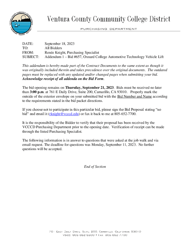 This document serves as an addendum to the contract documents related to the bid for the Oxnard College Automotive Technology Vehicle Lift project. It outlines changes, responses to bidder questions, and project specifications, including deadlines for bid submission and responsibilities during the bidding process.