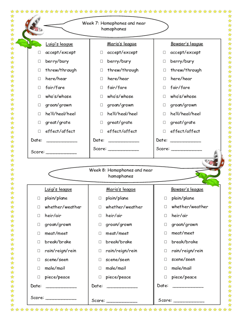 Week 7: Homophones and near homophones Marios leagueLuigis leagueBowsers leagueaccept/exceptaccept/exceptaccept/exceptberry/buryberry/buryberry/burythrew/throughthrew/throughthrew/throughhere/hearhere/hearhere/hearfair/farefair/farefair/farewhos/whosewhos/whosewhos/whosegroan/growngroan/growngroan/grownhell/heal/heelhell/heal/heelhell/heal/heel