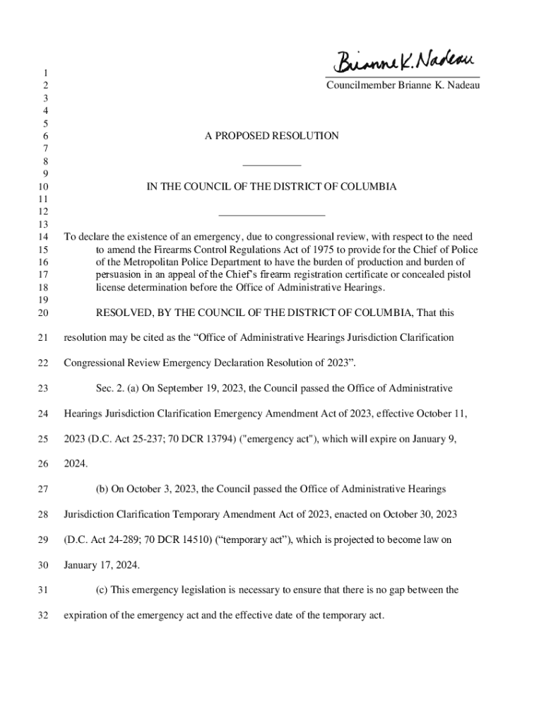 1 2 3 4 5 6 7 8 9 10 11 12 13 14 15 16 17 18 19 20___ Councilmember Brianne K. NadeauA PROPOSED RESOLUTION ___ IN THE COUNCIL OF THE DISTRICT OF COLUMBIA ___ To declare the existence of an emergency,