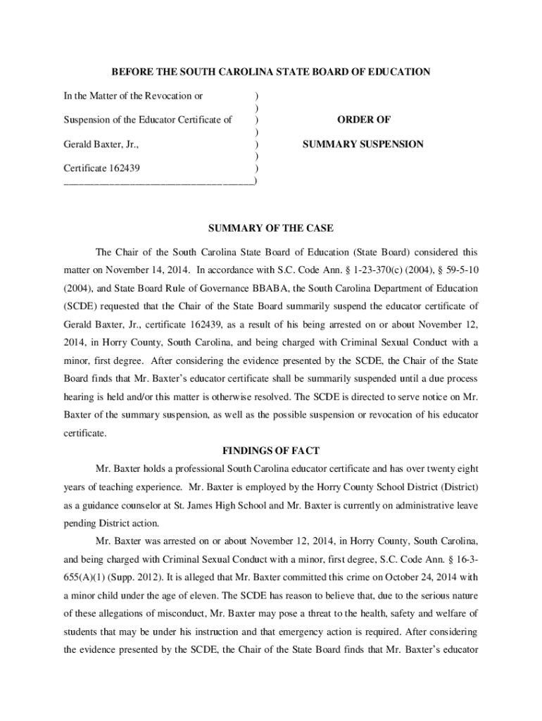 BEFORE THE SOUTH CAROLINA STATE BOARD OF EDUCATION In the Matter of the Revocation or) ) Suspension of the Educator Certificate of ) ) Gerald Baxter, Jr., ) ) Certificate 162439 ) ___ ___)ORDER OF