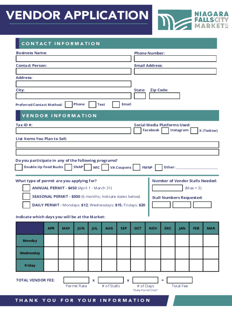VENDOR APPLICATION CONTACT INFORMATION Business Name:Phone Number:Contact Person:Email Address:Address: City:State:PhonePreferred Contact Method:Zip Code:EmailTextVENDOR INFORMATION Tax ID #:Social