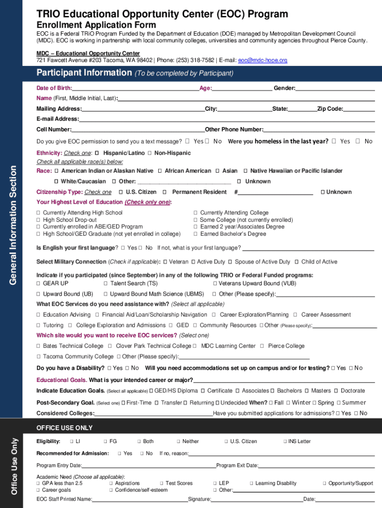 Get the free Trio Educational Opportunity Center (eoc) Program Enrollment Application Form