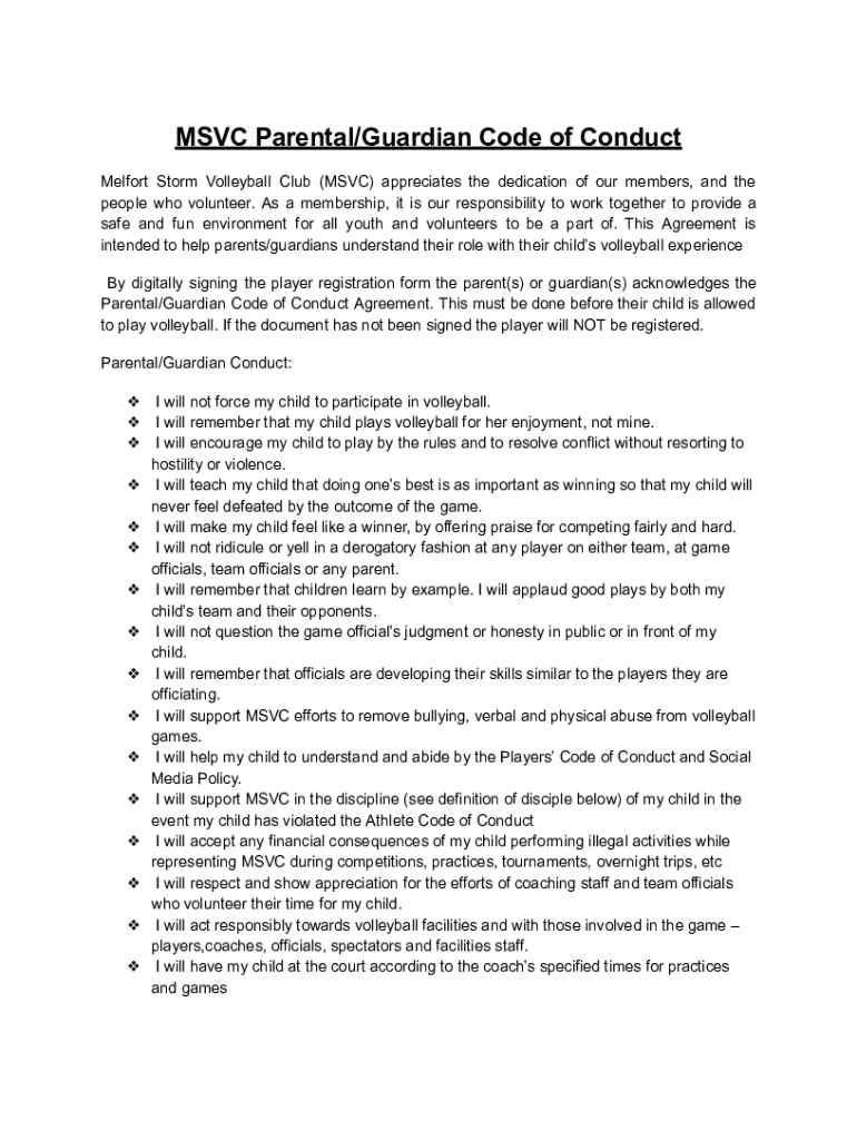 MSVC Parental/Guardian Code of Conduct Melfort Storm Volleyball Club (MSVC) appreciates the dedication of our members, and the people who volunteer. As a membership, it is our responsibility to work