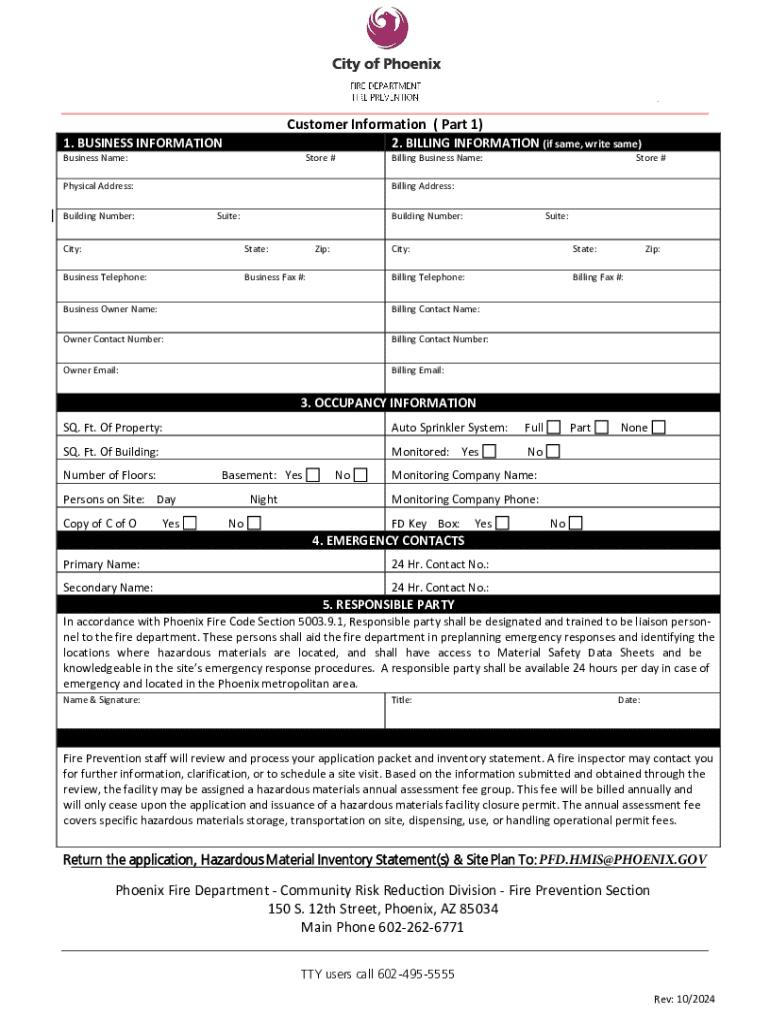 This application is mandatory for businesses that store, transport, dispense, use, or handle hazardous materials in accordance with City of Phoenix Code. It includes an annual assessment fee and requires a detailed inventory of hazardous materials, emergency contact information, and a site plan for safety compliance and effective emergency response.