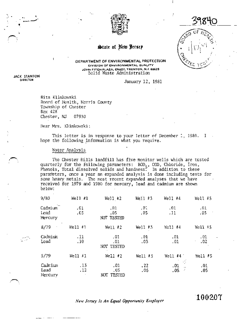?crstp&tate ofDEPARTMENT OF ENVIRONMENTAL PROTECTION DIVISION OF ENVIRONMENTAL QUALITY JOHN FITCH PLAZA. CN027. TRENTON. N.J. 08625Solid Waste AdministrationJACK STANTON DIRECTORJanuary 12, 1981 Rita