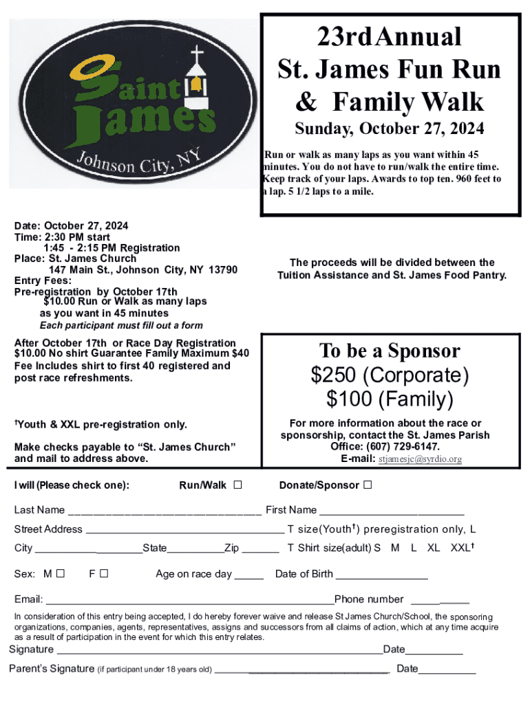 Join us for the 23rd Annual St. James Fun Run & Family Walk on October 27, 2024. Participants can run or walk as many laps as they want in 45 minutes. Awards will be given to the top ten participants. Proceeds will benefit Tuition Assistance and the St. James Food Pantry. Pre-registration is required for guaranteed shirts.