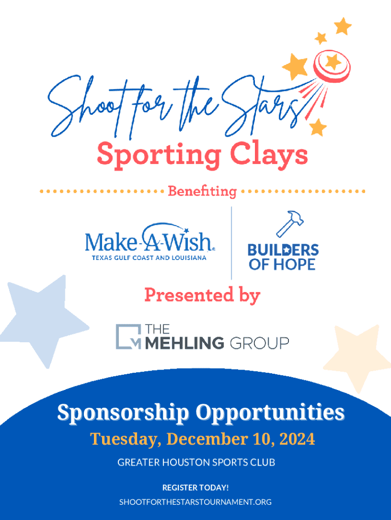 Sponsorship Opportunities Tuesday, December 10, 2024 GREATER HOUSTON SPORTS CLUB REGISTER TODAY! SHOOTFORTHESTARSTOURNAMENT.ORGBUILDERS OF HOPE AND MAKEAWISH ARE THRILLED TO HOST THE SECOND ANNUAL
