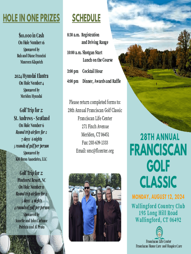 HOLE IN ONE PRIZES $10,000 in Cash On Hole Number 16 Sponsored by Bob and Diane Francini Maureen Klapatch2024 Hyundai Elantra On Hole Number 4 Sponsored by Meriden HyundaiGolf Trip for 2: St. Andrews