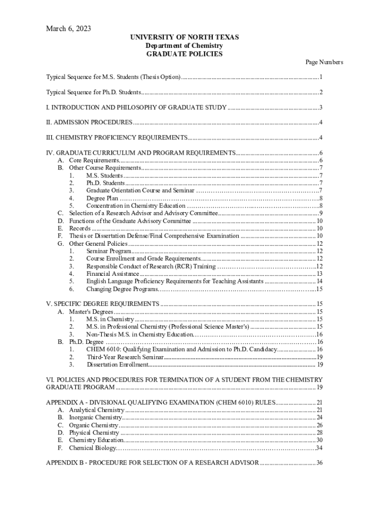 March 6, 2023 UNIVERSITY OF NORTH TEXAS Department of Chemistry GRADUATE POLICIES Page Numbers Typical Sequence for M.S. Students (Thesis Option) ......................................................................................