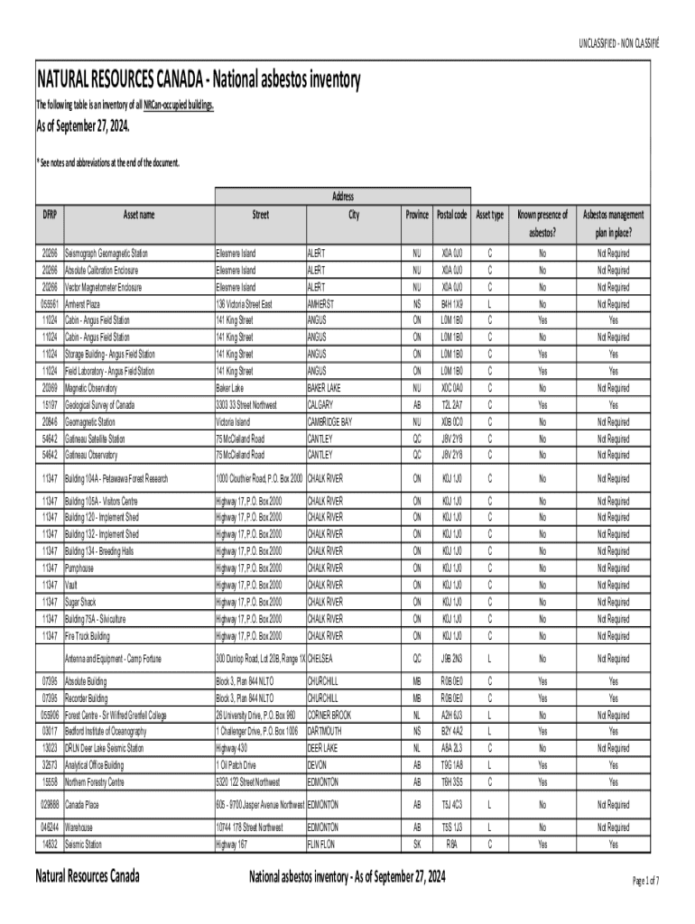 UNCLASSIFIED NON CLASSIFI #NATURAL RESOURCES CANADA National asbestos inventory The following table is an inventory of all NRCanoccupied buildings.As of September 27, 2024. * See notes and abbreviations