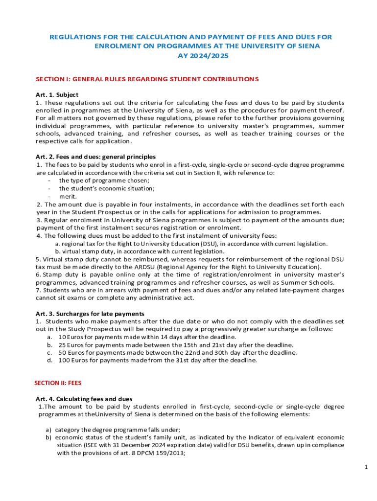 This document outlines the regulations regarding the calculation and payment of fees and dues for students enrolling at the University of Siena for the academic year 2024/2025. It provides clear guidelines on fee structures based on economic situations, merit, payment schedules, surcharges for late payments, and other pertinent details related to enrolment and academic progress.