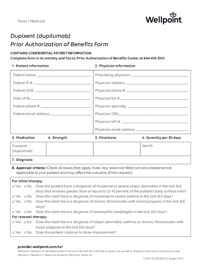 Texas | MedicaidDupixent (dupilumab) Prior Authorization of Benefits Form CONTAINS CONFIDENTIAL PATIENT INFORMATION Complete form in its entirety and fax to: Prior Authorization of Benefits Center