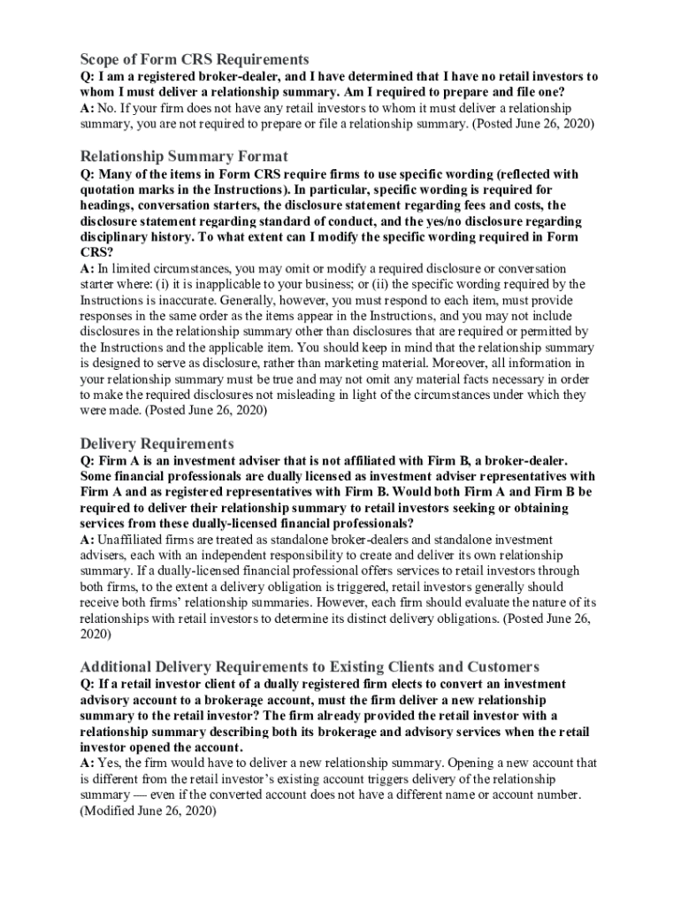 Scope of Form CRS Requirements Q: I am a registered brokerdealer, and I have determined that I have no retail investors to whom I must deliver a relationship summary. Am I required to prepare and