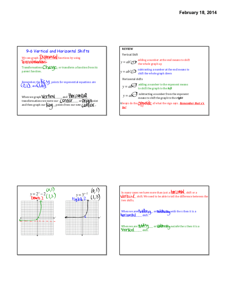 February 18, 201496 Vertical and Horizontal Shifts Wecangraph___functionsbyusing ___.REVIEW VerticalShift addinganumberattheendmeanstoshift thewholegraphupTransformations___ortransformafunctionfromits