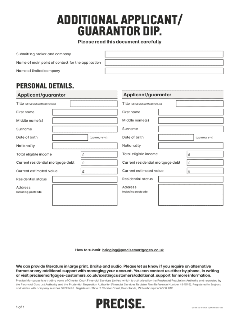 This document is intended for individuals applying as additional applicants or guarantors for a mortgage with Precise Mortgages. It includes sections for personal details, income, residential status, and contact information for submitting the application.