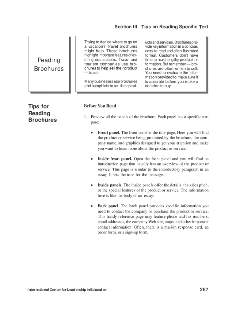 Section III Tips on Reading Specific TextReading BrochuresTrying to decide where to go on a vacation? Travel brochures might help. These brochures highlight important features of exciting destinations.