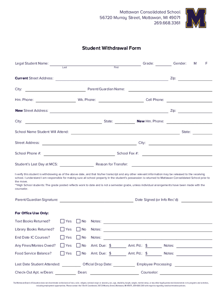 Mattawan Consolidated School 56720 Murray Street, Mattawan, MI 49071 269.668.3361Student Withdrawal Form Legal Student Name:Grade: LastGender:MFFirstCurrent Street Address:Zip:City:Parent/Guardian