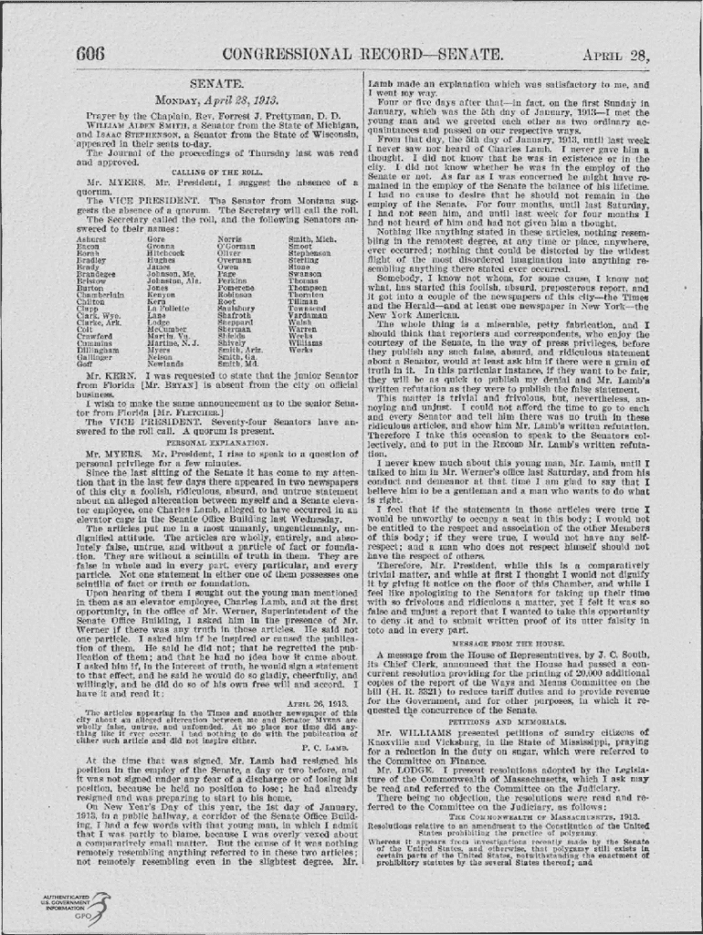 606CONGRESSIONAL RECORDSEN ATE. SENATE. MoNDAY,April 8, 1913.Prayer by the Chaplain, Rev. Forrest J. Prettyman, D. D. Wn..LIAM ALDEN SMITH, a Senator from the State of Michigan, and Is.A.Ac STEPHENSON.