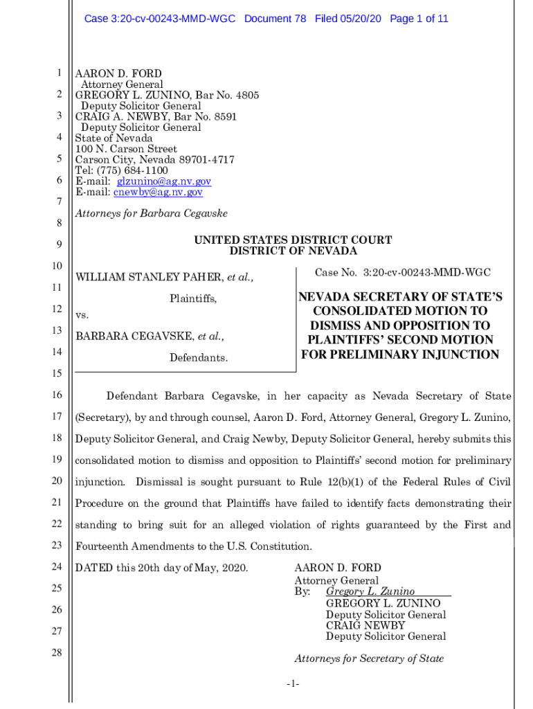 Case 3:20cv00243MMDWGC Document 78 Filed 05/20/20 Page 1 of 111 2 3 4 5 6 7 8AARON D. FORD Attorney General GREGORY L. ZUNINO, Bar No. 4805 Deputy Solicitor General CRAIG A. NEWBY, Bar No. 8591 Deputy
