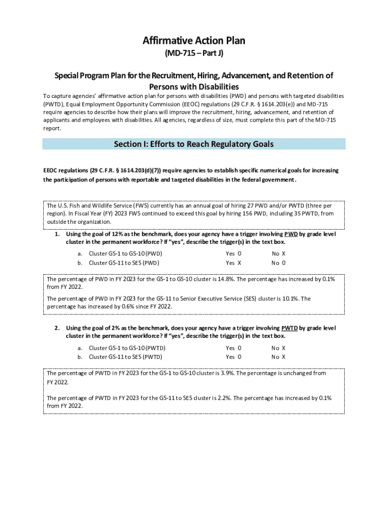 This document outlines the U.S. Fish and Wildlife Service\'s affirmative action plan to enhance recruitment, hiring, advancement, and retention of persons with disabilities (PWD) and persons with targeted disabilities (PWTD) as per EEOC regulations. It highlights specific efforts, goals, and programs in place to support and develop individuals with disabilities in the workforce, ensuring compliance with federal guidelines.