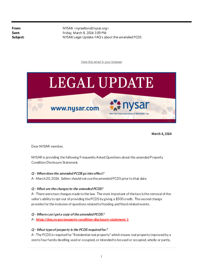 From: Sent: Subject:NYSAR nyrealtors@nysar.org Friday, March 8, 2024 3:09 PM NYSAR Legal Update: FAQ\'s about the amended PCDSView this email in your browserMarch 8, 2024 Dear NYSAR member, NYSAR