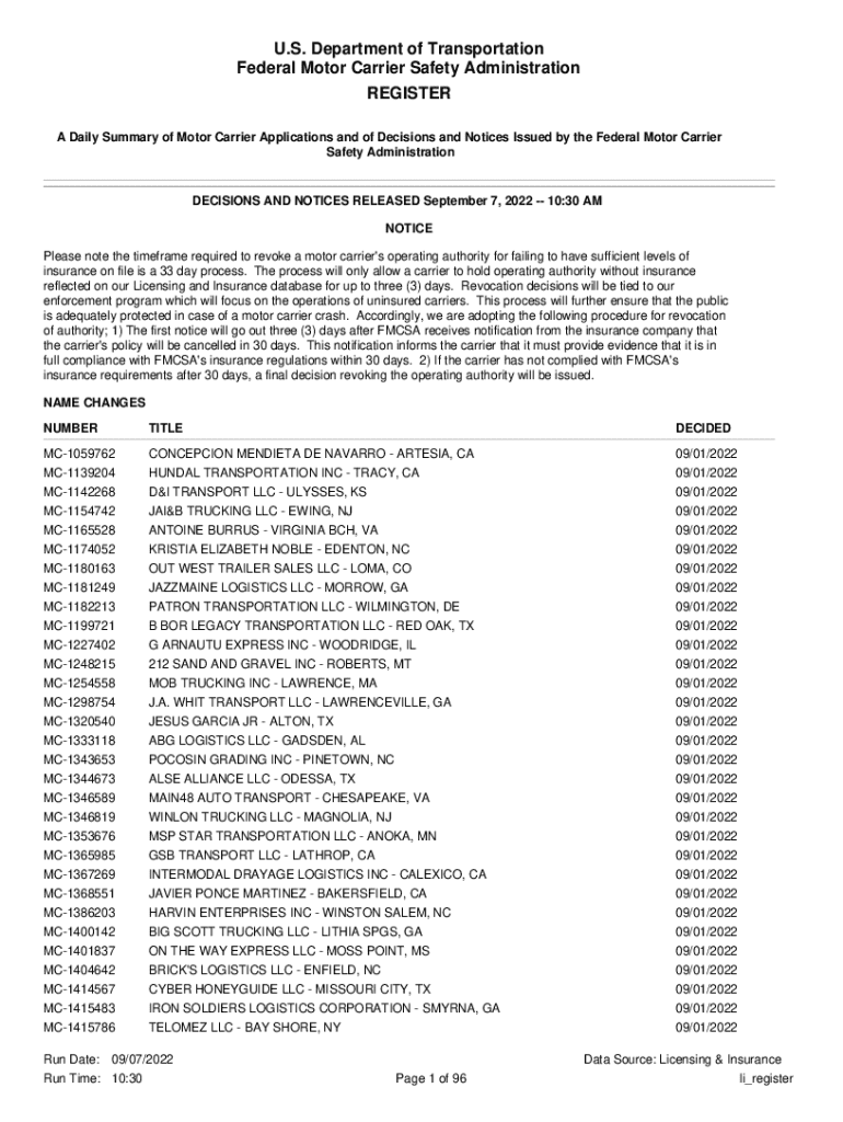 U.S. Department of Transportation Federal Motor Carrier Safety Administration REGISTER A Daily Summary of Motor Carrier Applications and of Decisions and Notices Issued by the Federal Motor Carrier