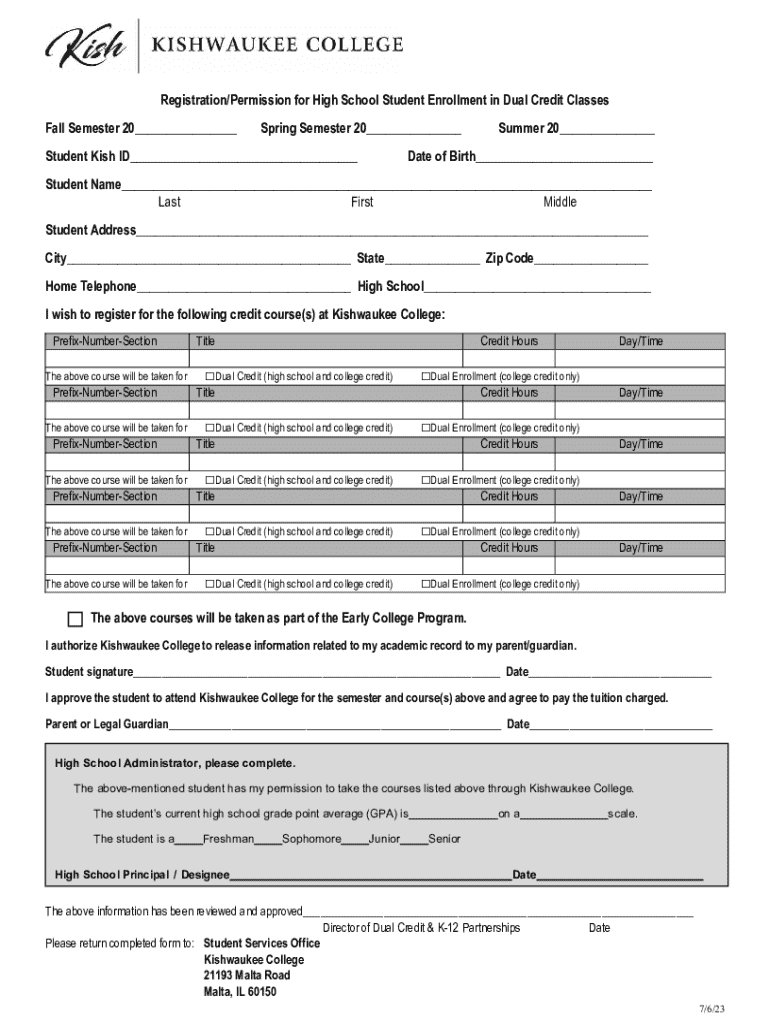 This document is used for registering high school students for dual credit classes at Kishwaukee College, allowing them to earn both high school and college credits. It includes sections for student information, course selection, parental approval, and school administrator verification.
