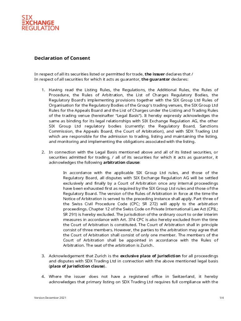 This document serves as a declaration of consent from the issuer or guarantor relating to all securities listed or traded. It includes acknowledgments of the binding nature of various listing and arbitration rules, jurisdiction for disputes, compliance requirements for issuers, and the precedence of the German version of the legal basis. The issuer or guarantor must provide their service address and contact information.