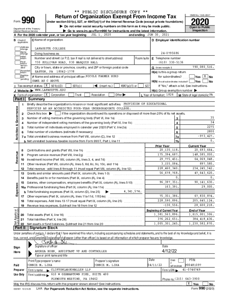 This document is the annual return filed by Lafayette College, a tax-exempt organization under section 501(c)(3) of the Internal Revenue Code. It contains detailed information about the college\'s revenue, expenses, assets, governance, and fundraising activities, providing transparency in its operations and financial status.