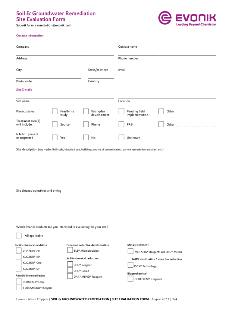 Soil & Groundwater Remediation Site Evaluation Form Submit form: remediation@evonik.com Contact information CompanyContact nameAddressPhone numberCityState/provincePostal codeCountryemailSite Details