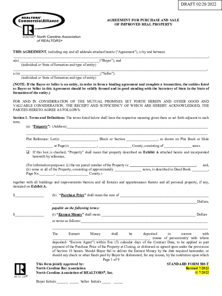 This document outlines the terms and conditions for the purchase and sale of improved real property, detailing the responsibilities of the Buyer and Seller, the Purchase Price, Earnest Money provisions, and other critical terms related to the transaction. It also includes sections on title examination, environmental disclosures, broker information, and closing procedures.