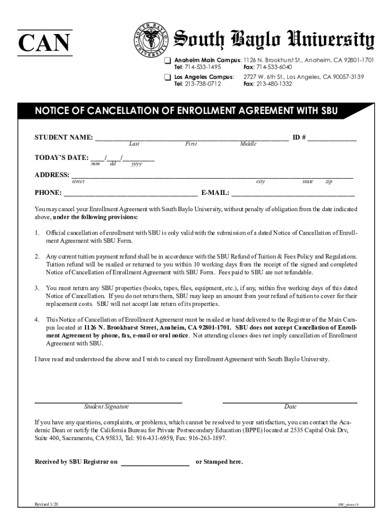 This document outlines the process for students to cancel their enrollment agreement with South Baylo University. It includes details on the necessary steps, refund policies, and the responsibilities of the student upon cancellation.