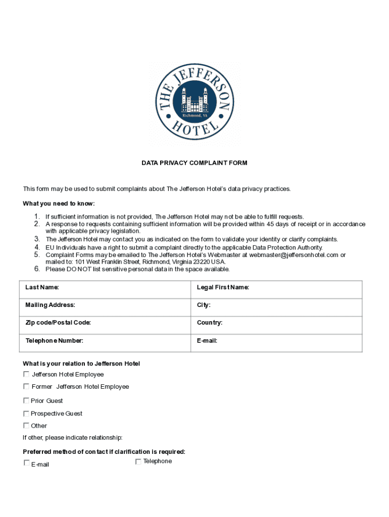 This form is designed for individuals to submit complaints regarding The Jefferson Hotel’s data privacy practices. It outlines the necessary information required for the complaint to be processed and the rights of individuals under applicable privacy laws.