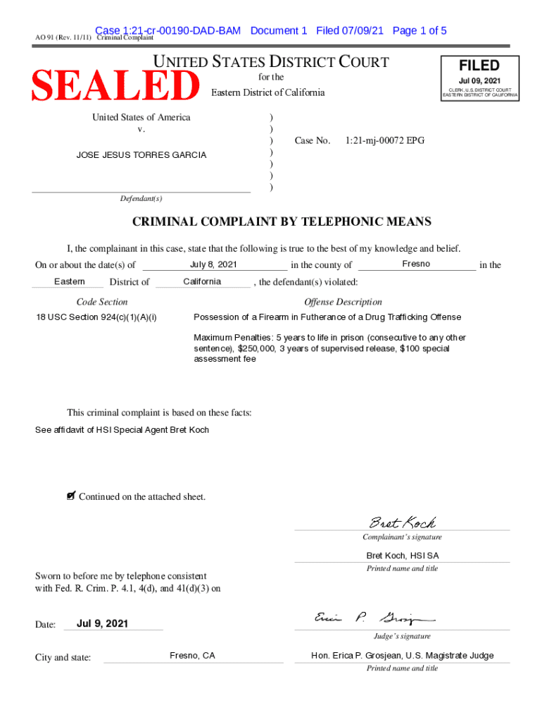 Case 1:21cr00190DADBAM Document 1 Filed 07/09/21 Page 1 of 5AO 91 (Rev. 11/11) Criminal ComplaintUNITED STATES DISTRICT COURTSEALEDFILEDfor theJul 09, 2021Eastern District ofof California ___ District ___United States of America v. JOSE JESUS TORRES GARCIA) ) ) ) ) ) )Case No.CLERK, U.S. DISTRICT COURT EASTERN DISTRICT OF CALIFORNIA1:21mj00072 EPGDefendant(s)CRIMINAL COMPLAINT BY TELEPHONIC MEANS I, the complainant in this case, state that the following is true to the best of my knowledge and...