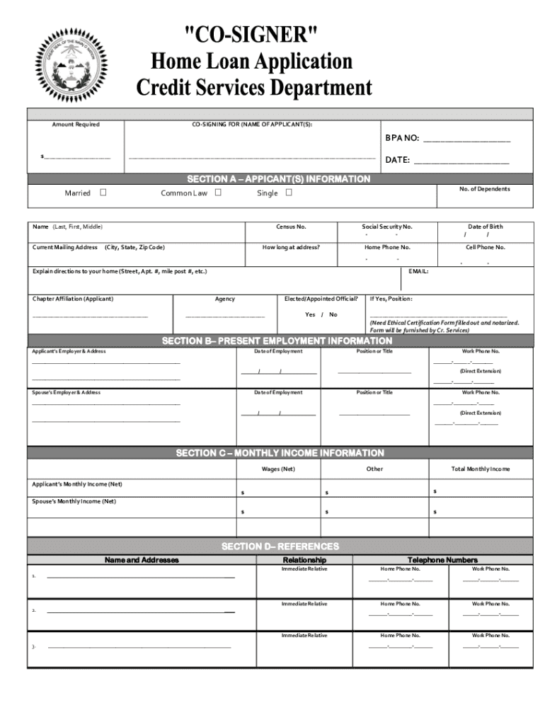 Amount RequiredCOSIGNING FOR (NAME OF APPLICANT(S):BPA NO: ___ $______DATE: ___SECTION A APPICANT(S) INFORMATION MarriedCommon LawName (Last, First, Middle) Current Mailing AddressSingleNo. of DependentsCensus