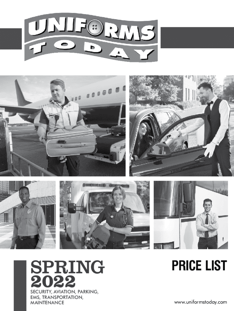 SPRING 2022 SECURITY, AVIATION, PARKING, EMS, TRANSPORTATION, MAINTENANCEPRICE LIST www.uniformstoday.comPRICE LIST | SPRING 2022 ITEM #DESCRIPTIONSIZELISTPAGE 2 11 100% POLYESTER SHORT SLEEVE SECURITY