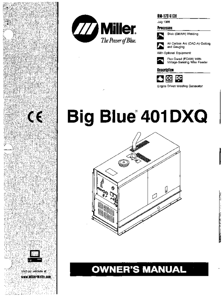 This owner\'s manual provides comprehensive information on the operation, maintenance, and safety precautions for the Miller Big Blue 401 DX and DXQ engine-driven welding generators. The manual covers welding processes, installation, troubleshooting, and warranty information, ensuring users understand how to operate the machine safely and effectively.