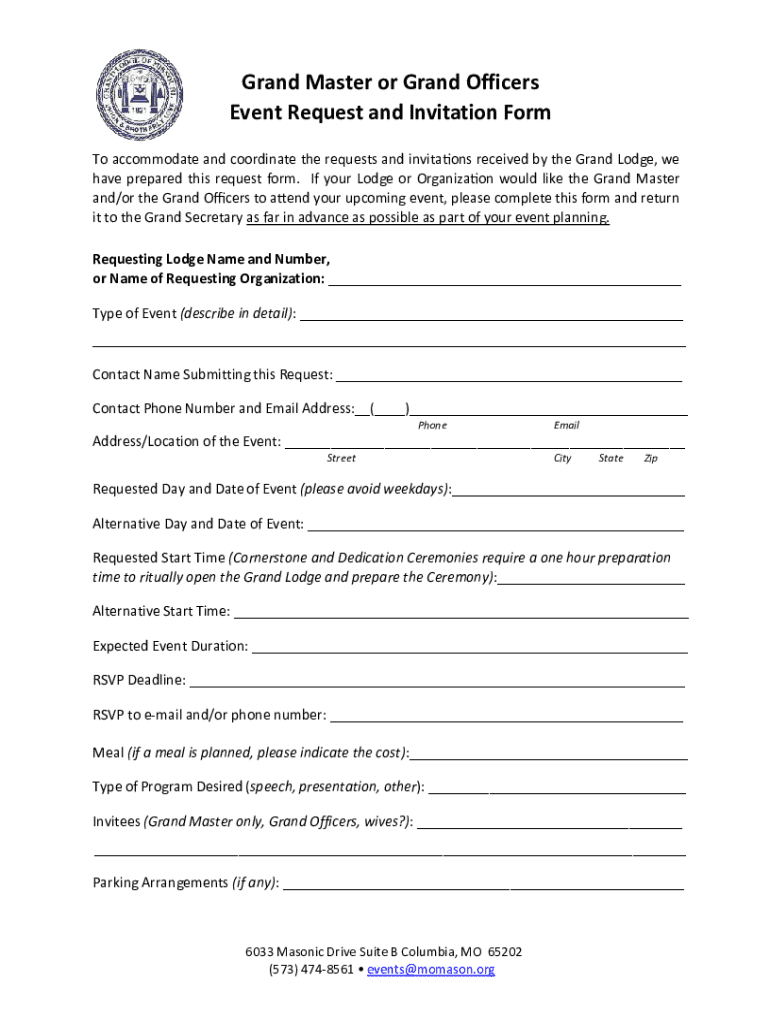 Grand Master or Grand Officers Event Request and Invitation Form To accommodate and coordinate the requests and invitaons received by the Grand Lodge, we have prepared this request form. If your Lodge