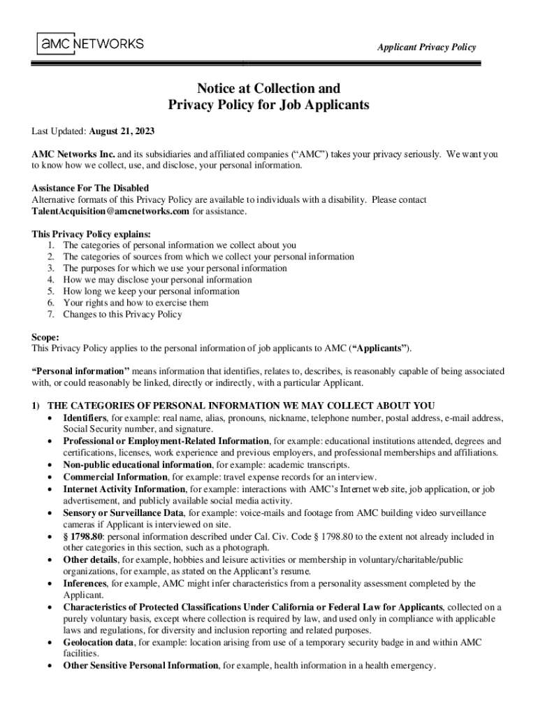 This privacy policy outlines how AMC Networks Inc. collects, uses, and discloses personal information related to job applicants. It covers categories of personal information collected, purposes of collection, rights of applicants, and more, while ensuring compliance with privacy laws.