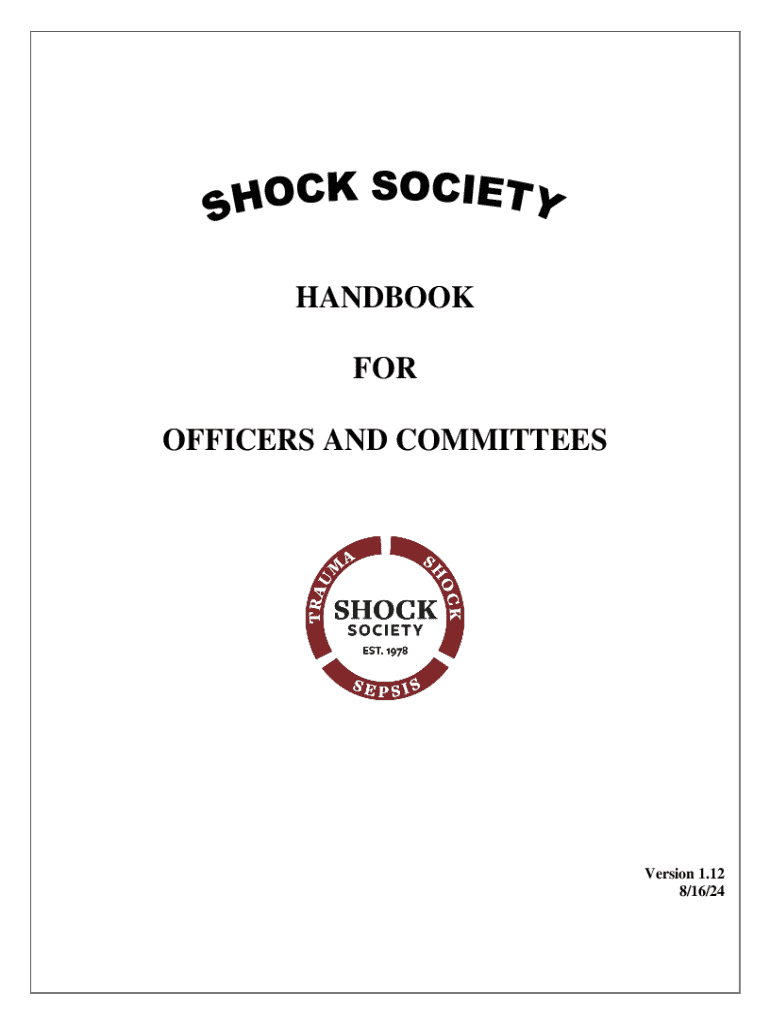 This handbook serves as a comprehensive guide for officers and committees of the Shock Society, detailing responsibilities, organizational structure, historical context, and operational procedures including revisions, committee compositions, and award processes.