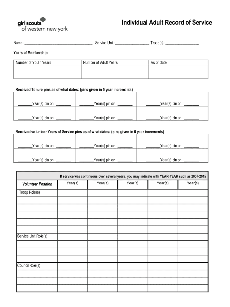 Individual Adult Record of Service Name: ___ Service Unit: ___ Troop(s): ___ Years of Membership: Number of Youth YearsNumber of Adult YearsAs of DateReceived Tenure pins as of what dates: (pins given