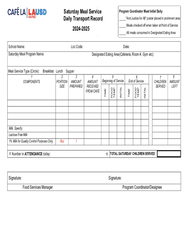 Saturday Meal Service Daily Transport RecordProgram Coordinator Must Initial Daily: ___And Justice for All poster placed in prominent area ___ Meals checked off when taken at Point of Service20242025