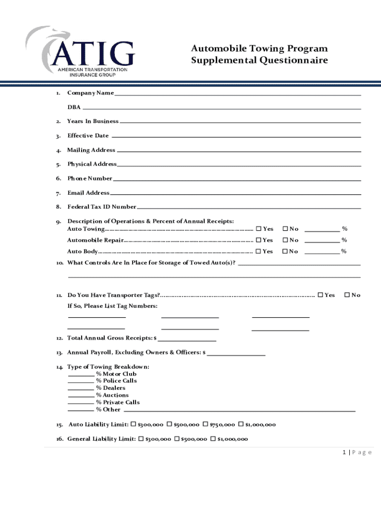 Automobile Towing Program Supplemental Questionnaire1.Company Name DBA2.Years In Business3.Effective Date4.Mailing Address5.Physical Address6. Phone Number 7.Email Address8. Federal Tax ID Number