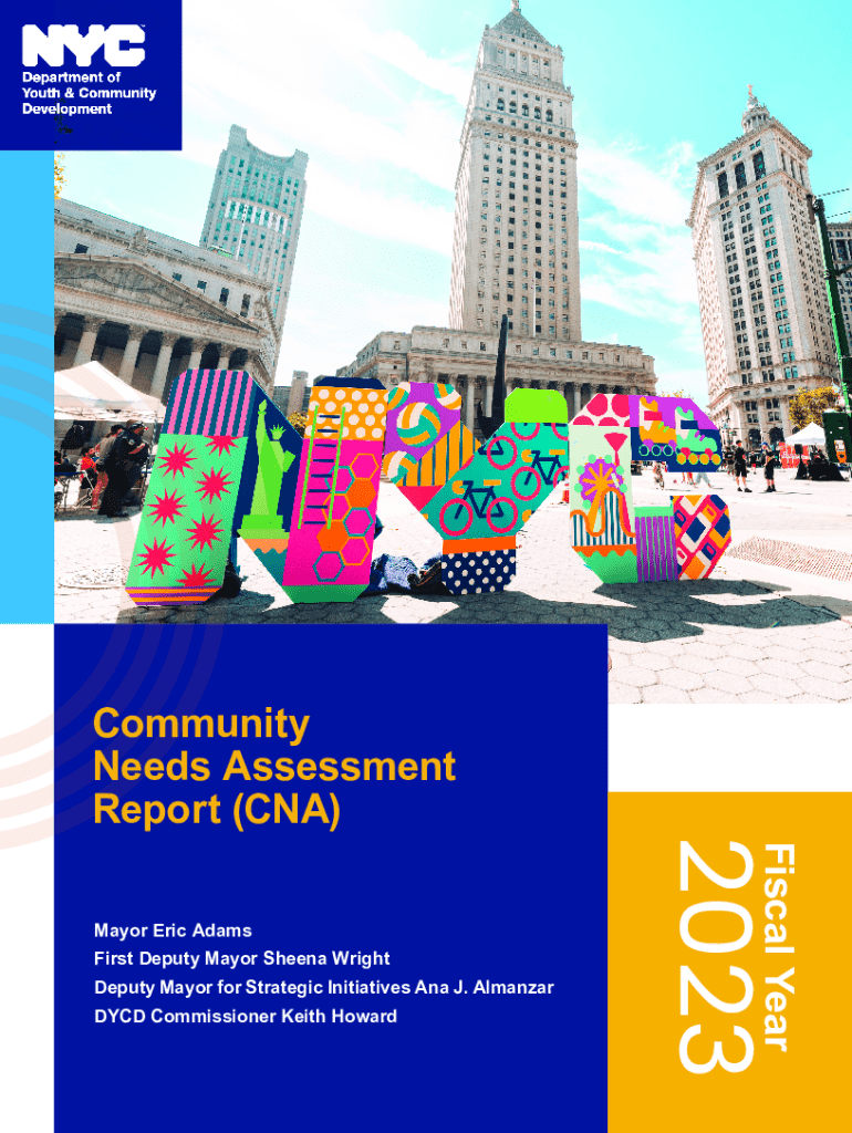 The Community Needs Assessment Report (CNA) for Fiscal Year 2023 details the findings from stakeholder engagements across New York City\'s neighborhoods. It aims to analyze community needs, assess gaps in services, and inform the Department of Youth and Community Development\'s (DYCD) funding priorities to alleviate poverty and improve quality of life in the city. The report outlines key findings from surveys conducted with New Yorkers regarding essential services like food and nutrition...