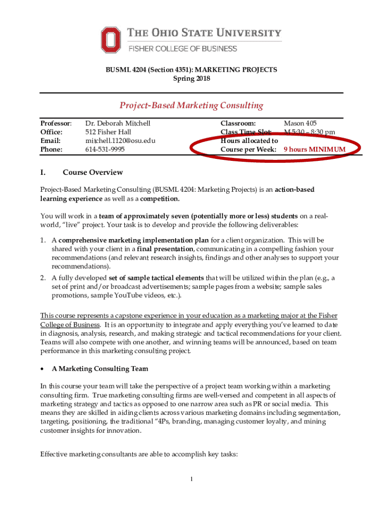 BUSML 4204 (Section 4351): MARKETING PROJECTS Spring 2018ProjectBased Marketing Consulting Professor: Office: Email: Phone:I.Dr. Deborah Mitchell 512 Fisher Hall mitchell.1120@osu.edu 6145319995Classroom: