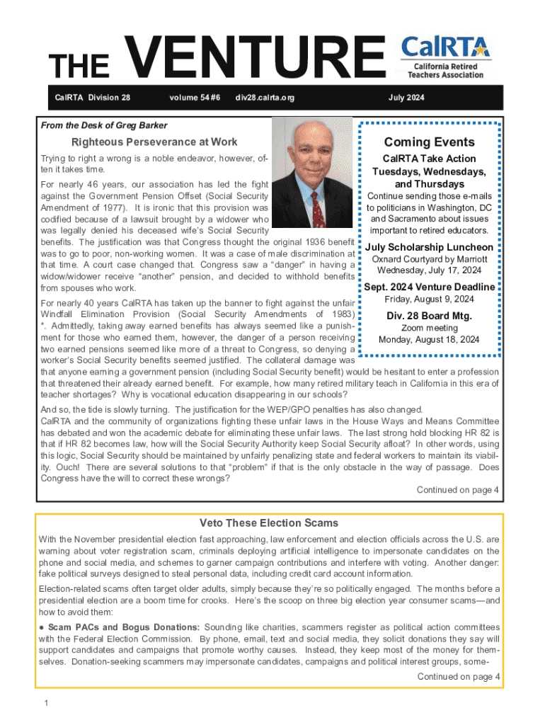 This document is the July 2024 issue of \'The Venture\', the newsletter for CalRTA Division 28, focusing on advocacy efforts for retired educators, upcoming events, financial reports, and important issues affecting retired teachers. It also includes information on scholarship recipients and membership news.