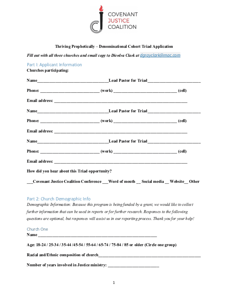 This document is an application form for churches to participate in a denominational cohort focused on justice ministry. It collects participant information, church demographics, and details about the proposed social issue or idea the cohort will address, along with its biblical ties.