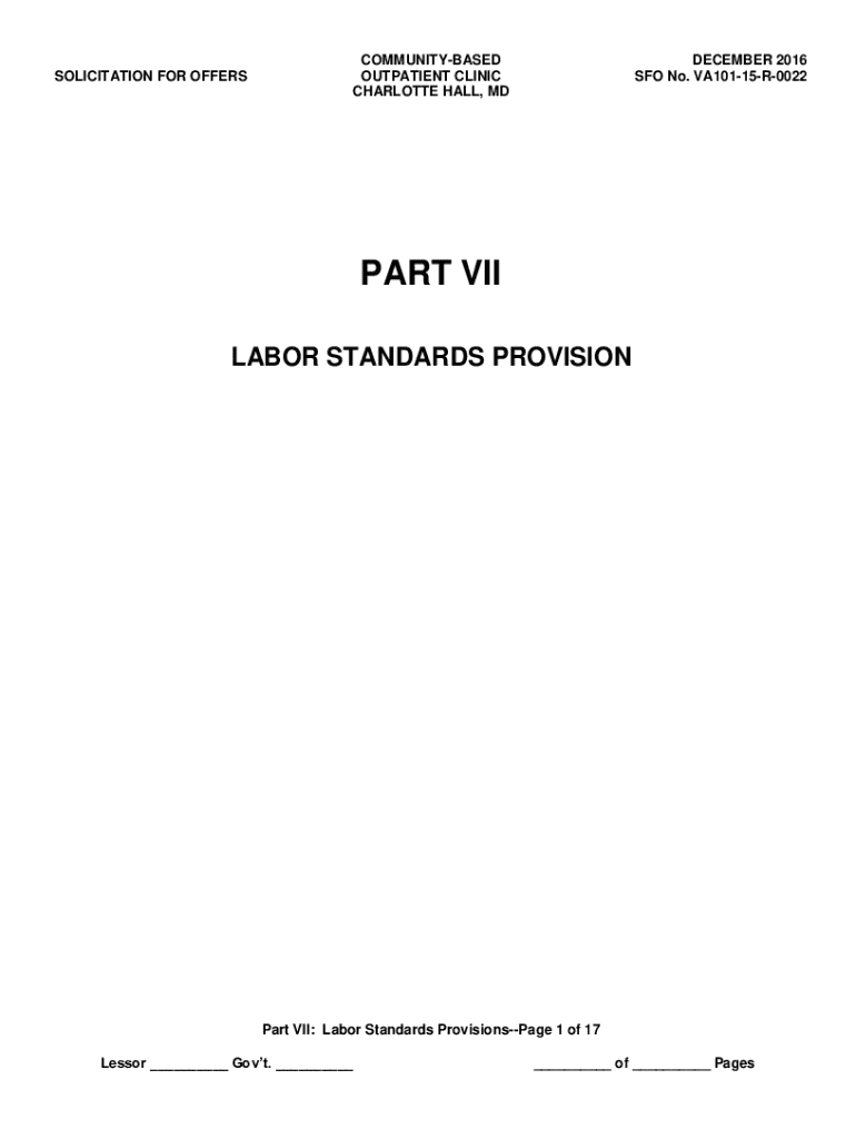 This document outlines the labor standards provisions related to contract work for the Community-Based Outpatient Clinic in Charlotte Hall, MD. It includes guidelines and regulations regarding overtime compensation, the Davis-Bacon Act, record-keeping requirements, and compliance with labor standards for contractors and subcontractors involved in the project.